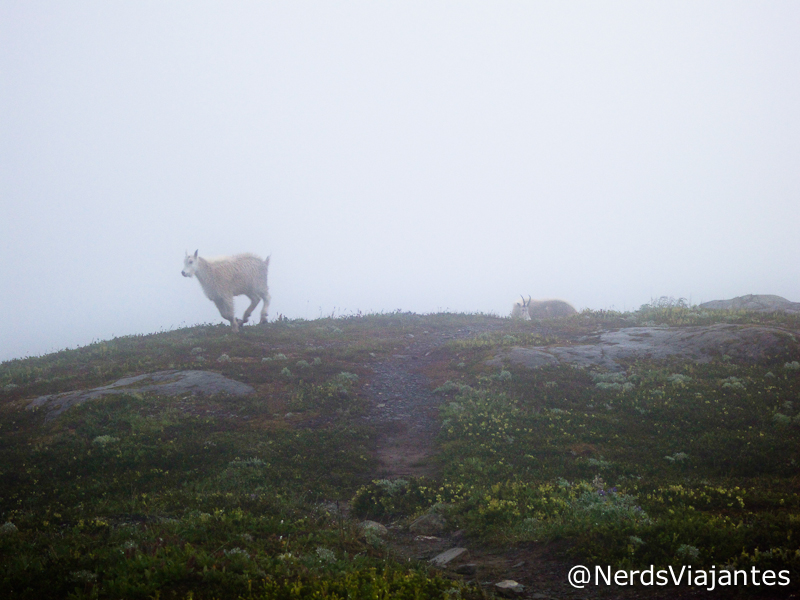 Paramos para descansar, comer alguma coisa e tomar água. Neste momento uma aparição nos emocionou. Aliás, uma não, mas várias. Um grupo de  mountain goats (cabras da montanha) apareceu e tinha até filhote. Me empolguei na hora.