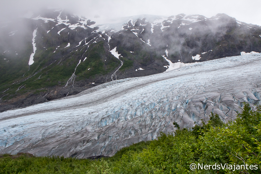 E bem perto da gente, do lado esquerdo, o Exit Glacier. Uma das paisagens mais belas que já vimos. Até ajudou a esquecer um pouco a chuva e o frio. 🙂 Infelizmente não deu para tirar muitas fotos porque não dava para ficar com a câmera fora da mochila por muito tempo, a chance de molhar era muito grande.
