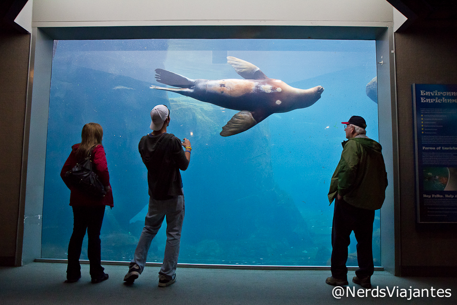 Descemos a escada para explorar o nível térreo. Nesta parte uma das atrações mais legais é o “Windows to the sea“, onde podemos ver a parte embaixo d’água dos habitats citados acima. Uma outra visão onde podemos ver os animais embaixo d’água. O primeiro aquário que vimos foi o da foca. Ela nadava tranquilamente pelo aquário, fazia piruetas e até posou para a foto! 😀