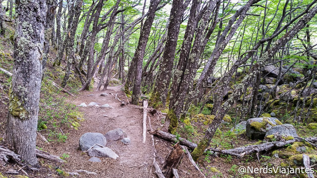 Quando o passeio do barco acabou, retornamos ao porto e começamos a fazer a trilha até o Glaciar Huemul. Este caminho está localizado dentro de uma área particular, a Estância Lago del Desierto. Eles cobram uma taxa para entrar (no nosso caso já estava incluída no pacote que compramos da Zona Austral) e mantém uma pequena estrutura com mesas de madeira e dois banheiros, um na entrada e outro depois de uns 300 metros de trilha. Quem optar por ir até o lago em carro próprio, é só estacionar na porta e pagar a taxa para uma pessoa que fica lá tomando conta. A entrada fica de frente para o começo do lago.